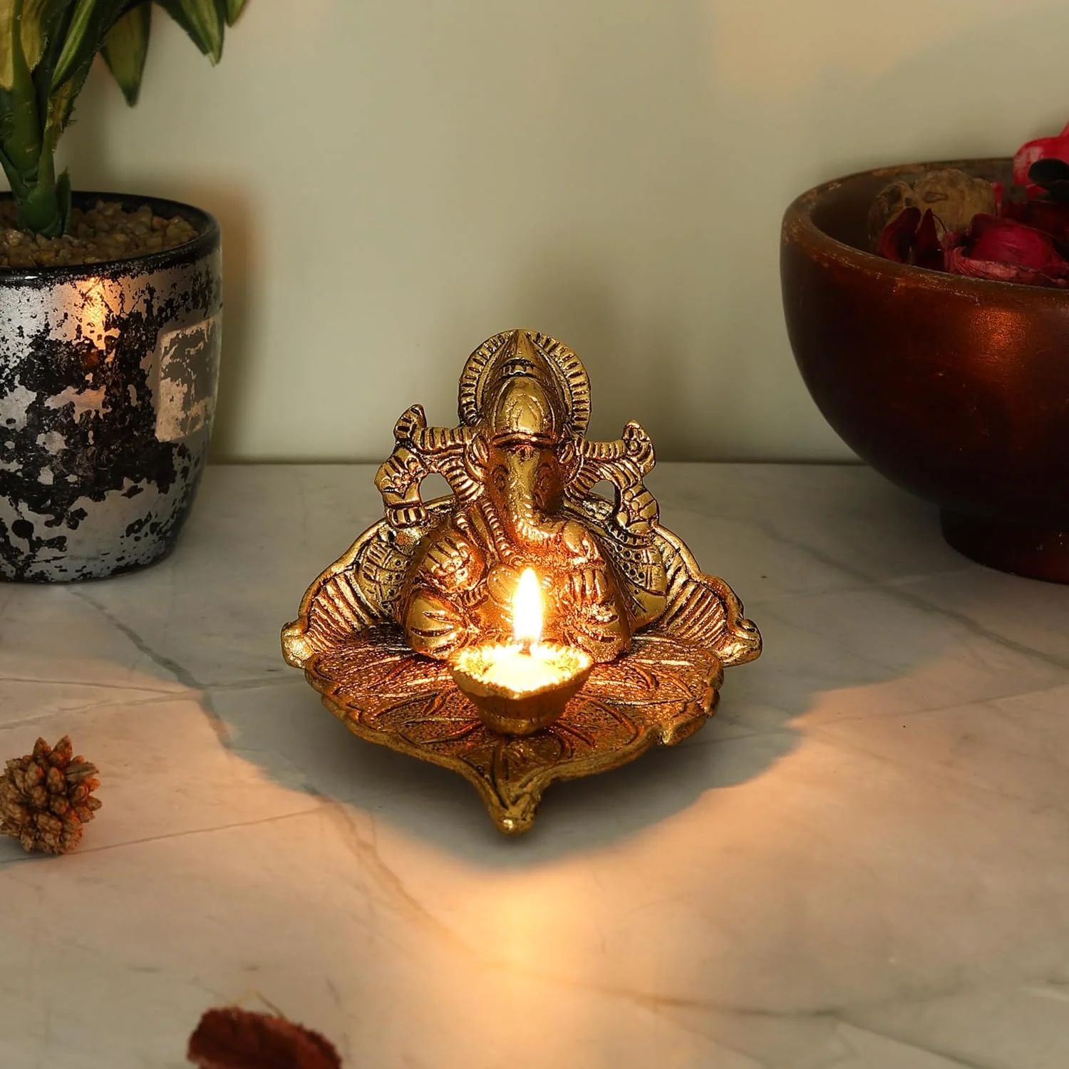 Available in different sizes, from compact tabletop options to larger, eye-catching centerpieces for home or temple decorative Ganesha statues can be transformed into stunning Diya oil lamp holders, adding elegance and charm to any space.